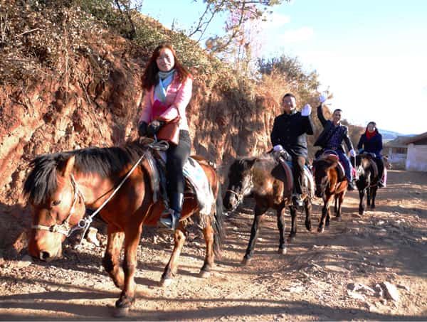 我們下了車,在導(dǎo)游的帶領(lǐng)下購買了門票,第一個(gè)節(jié)目就是騎馬。在這里騎馬跟想象中的出入較大,前面有馬夫牽著的,是一步一步的馱,不是能夠自由馳騁的那種。我們四個(gè)人一組在馬夫的帶領(lǐng)下去重走茶馬古道,體驗(yàn)一下當(dāng)年馬夫的艱辛。